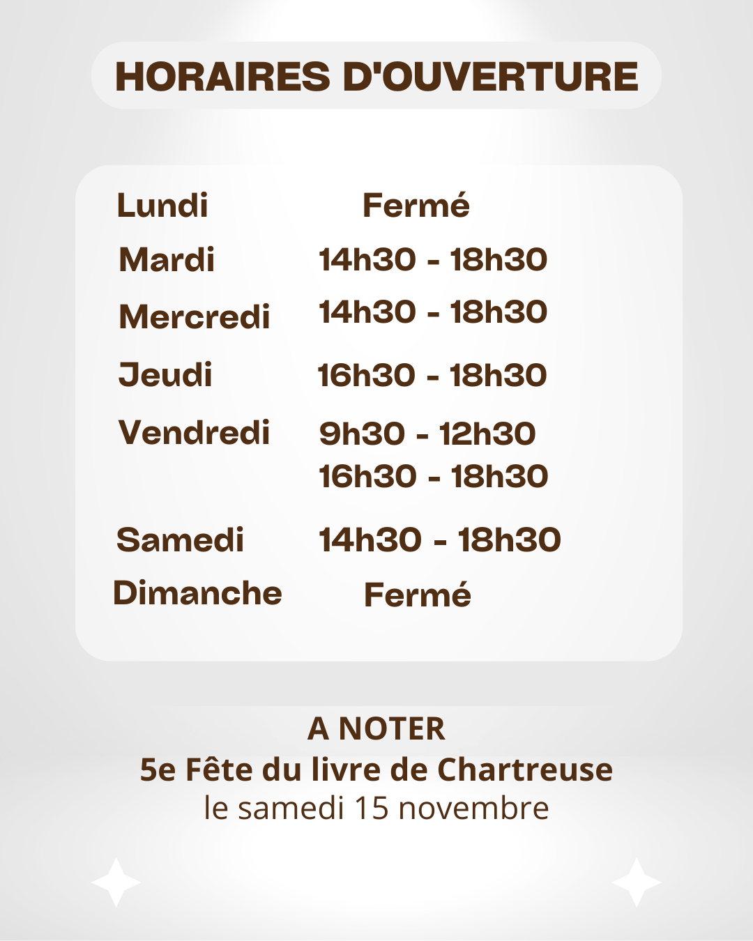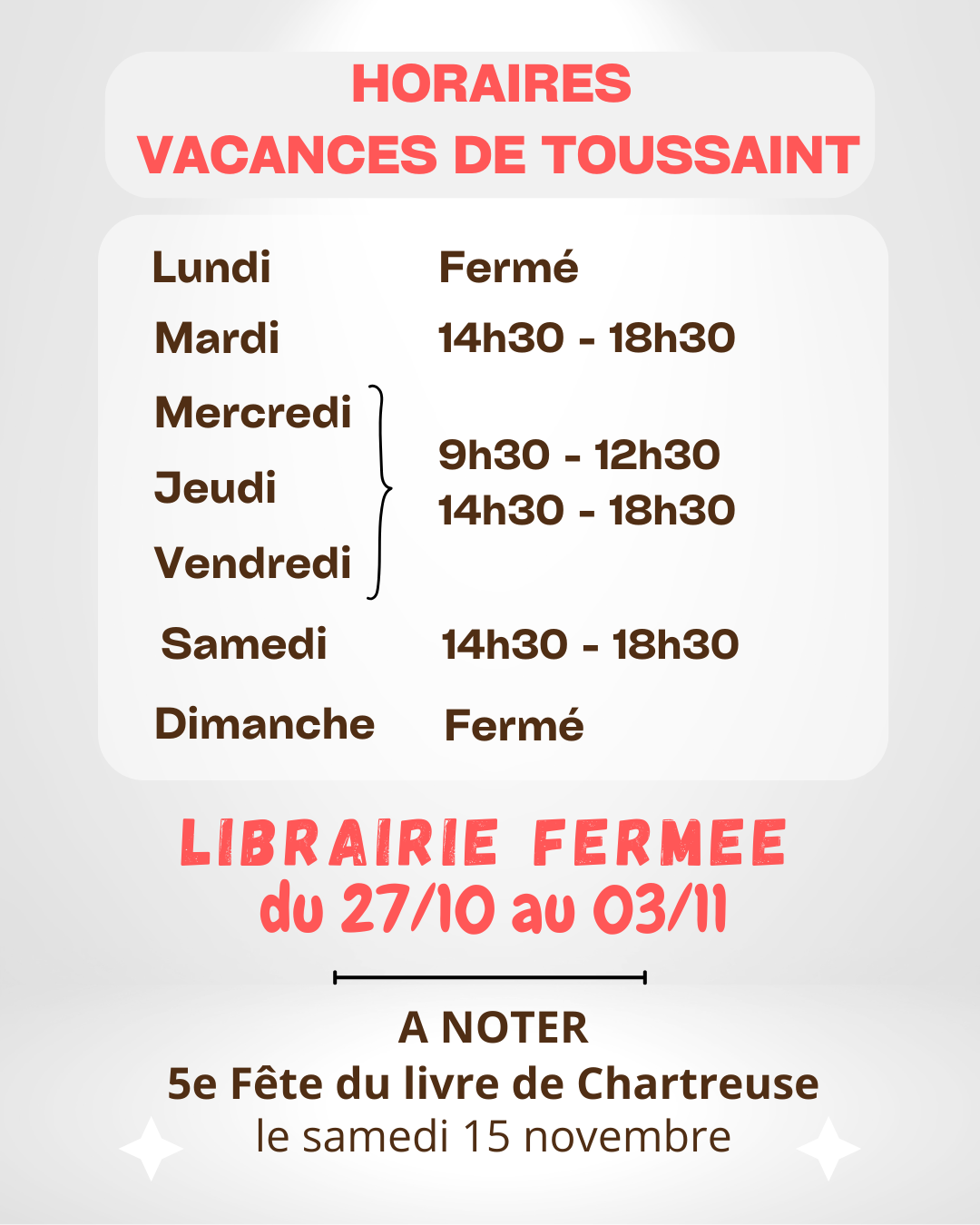 Ouvertures hors vacances scolaires ATTENTION, librairie fermée le mardi 9 et le jeudi 11 décembre Horaires des vacances de la Toussaint